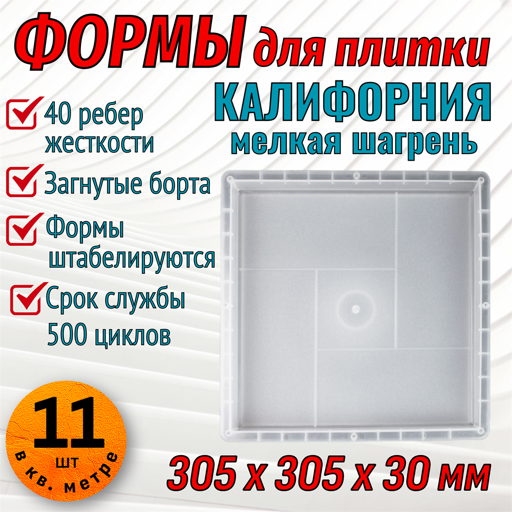 🔥 Форма Калифорния шагрень 305*305*30 мм отличается также своей усиленной конструкцией: её бортики загнуты по всему периметру и дополнительно снабжены ребрами жесткости. Работать с такой формой - сплошное удовольствие! Её периметр по-настоящему жесткий, что позволяет сохранять точную геометрию бетонных плиток от заливки к заливке на протяжении всего срока эксплуатации формы.