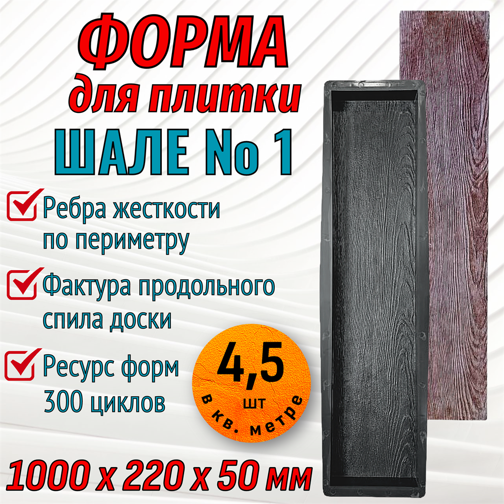 Форма Шале №1 это профессиональная матрица, предназначенная для производства тротуарной плитки с эффектом натурального дерева. Эта высокотехнологичная форма объединяет в себе эстетическую привлекательность и выдающуюся прочность, что делает её идеальным выбором для создания стильных и долговечных дорожек, площадок и других элементов благоустройства.